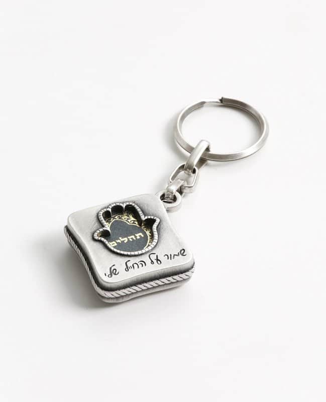 מחזיק המפתחות מעוצב כקופסא, שבתוכה ספר תהילים קטן לדרך.