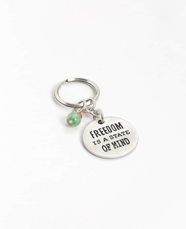 המחזיק מעוצב כעיגול שמצידו האחד כתובות המילים Freedom is a state of mind ומצידו השני ציור של זוג ציפורים על ענף.