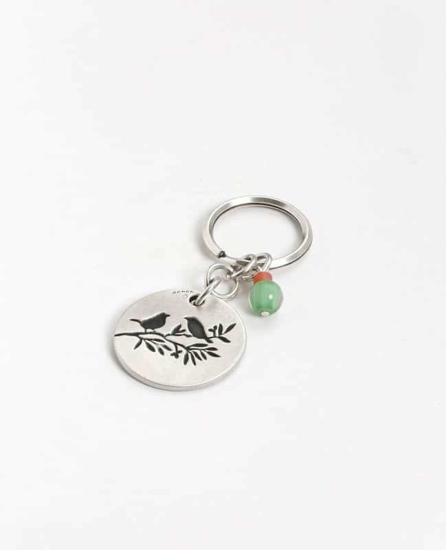 העיגול מחובר לטבעת מחזיק המפתחות על ידי שלוש טבעות חזקות, שעל העליונה ביניהן תלויים חרוזים מקסימים בירוק וכתום. פשוט, מדויק, יפהפה וכל כך משמעותי.