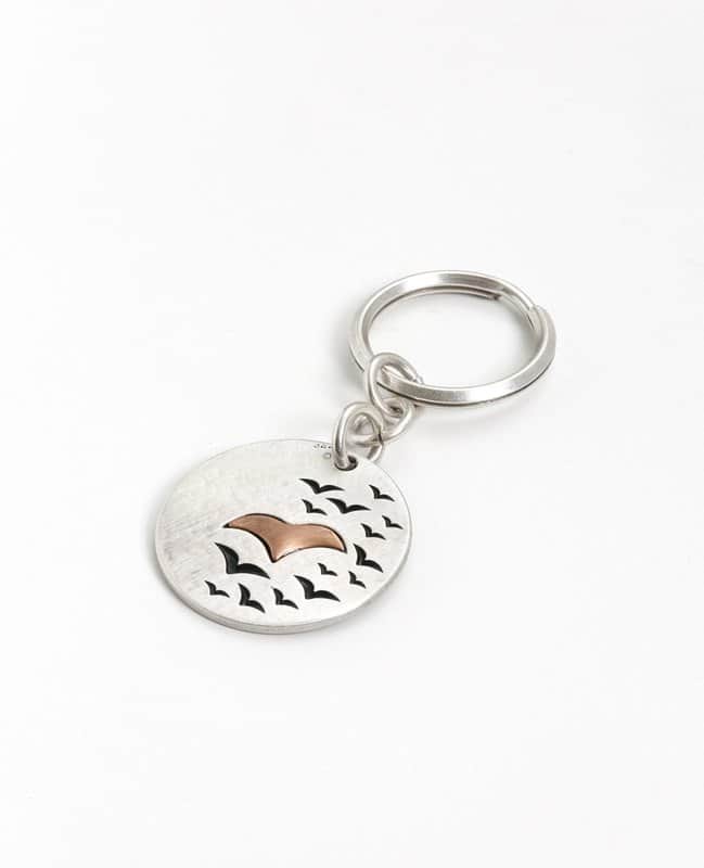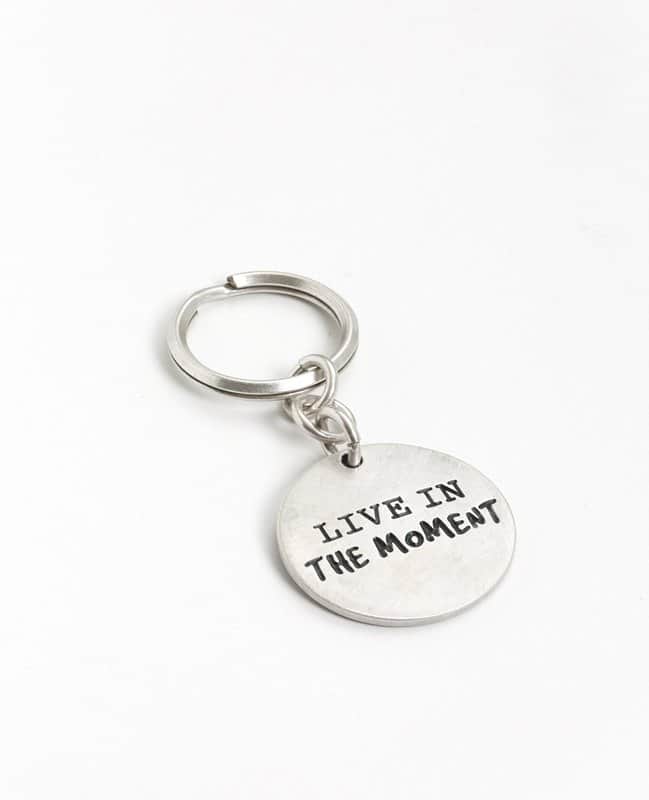 מחזיק המפתחות מעוצב כמתלה עיגול שבצידו האחד כתובות המילים Live in the moment ובצידו השני תבליט ציפור גדולה בציפוי נחושת שסביבה מתעופפות ציפורים בצבע שחור. כל אלה על רקע ציפוי כסף טהור.
