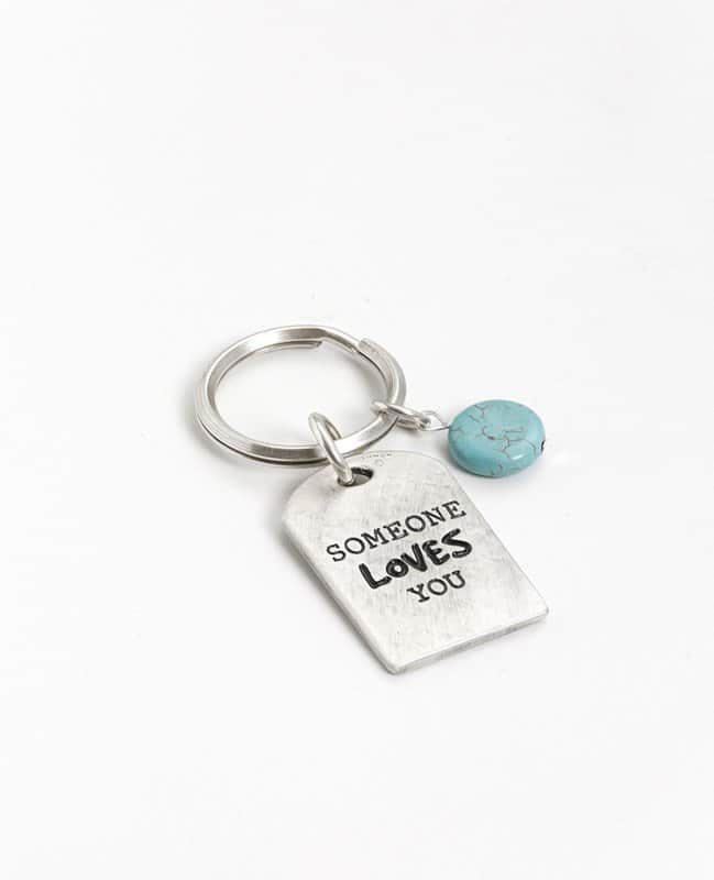 מחזיק מפתחות בעיצוב מרשים ומרגש, מעוצב כפלטה מלבנית שמצידה האחד הכיתוב Drive Safely ומצידה השני המילים Someone loves you.