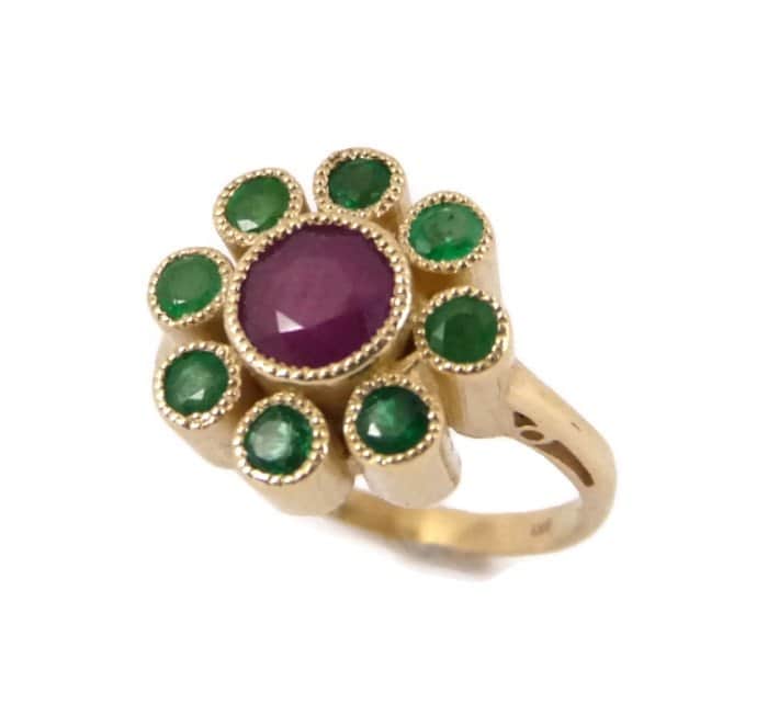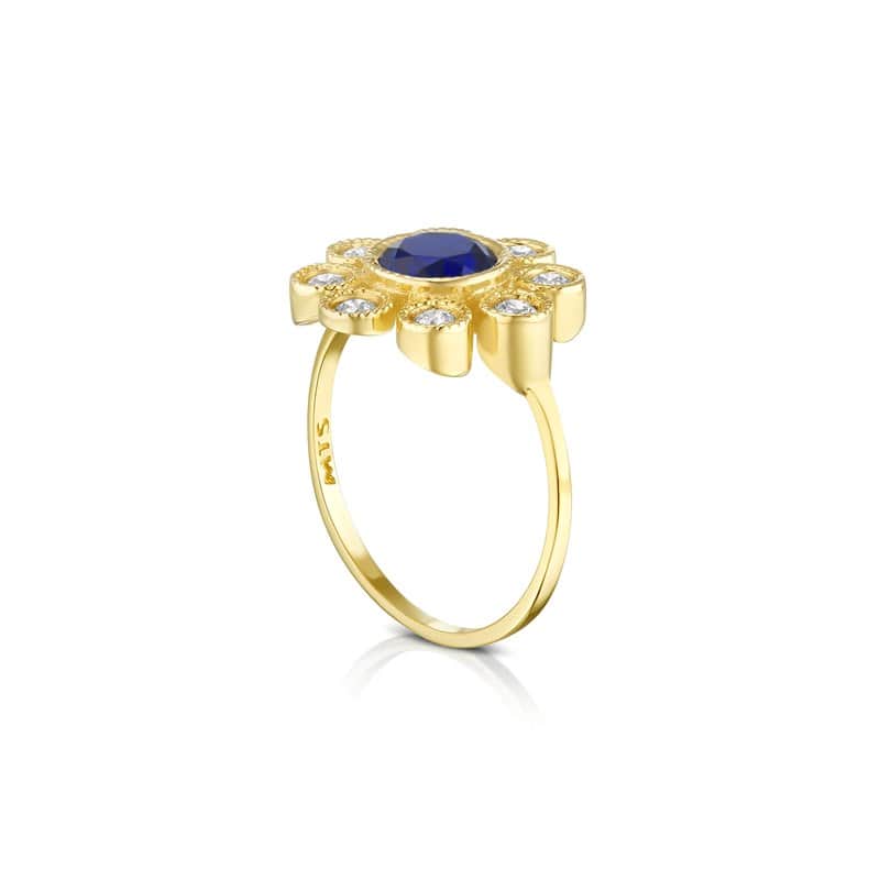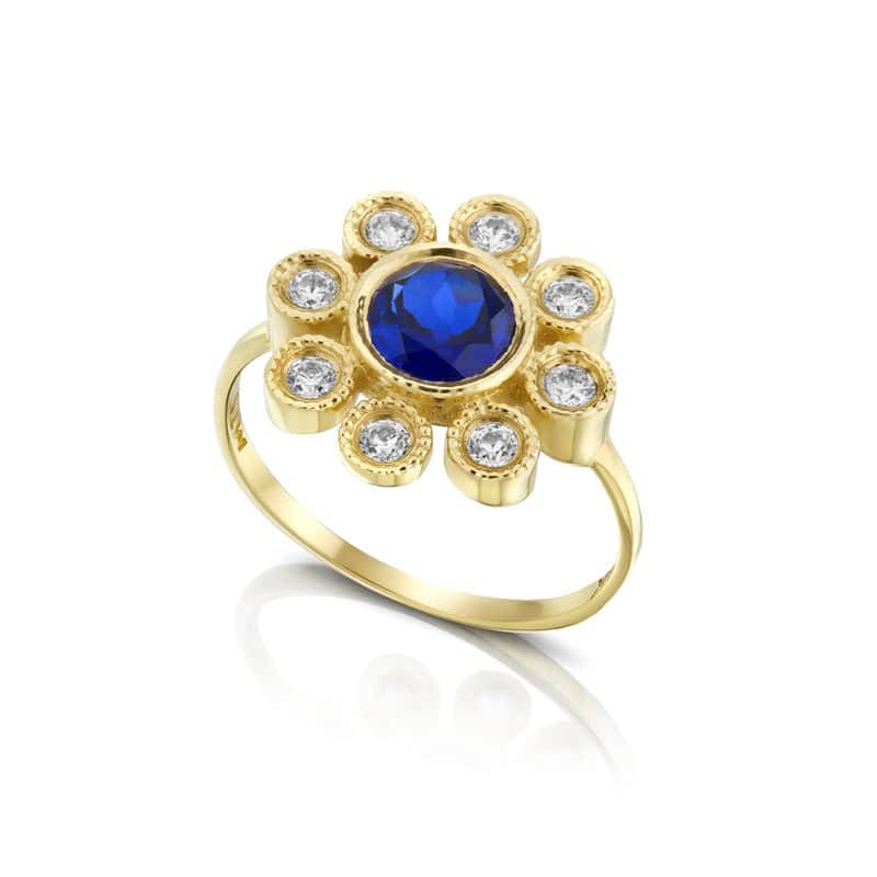 טבעת הפרח "שקד" זהב , משובצת אבן מרכזית (לבחירה) ואבני חן / זירקונים סביב , 14K