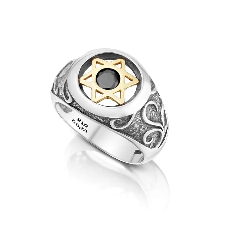 טבעת מגן דוד מעוטרת משובצת אבן אוניקס (לבחירה) , כסף וזהב