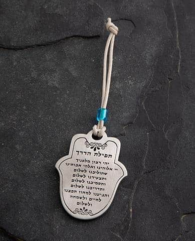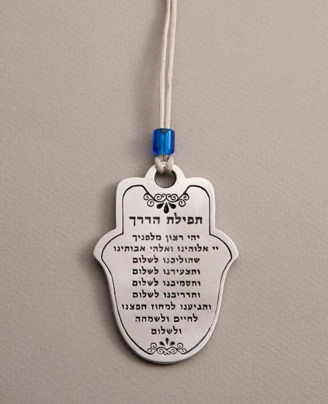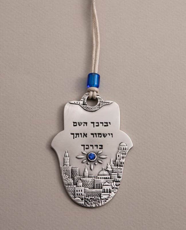 מתלה קטן מצופה כסף טהור בצורת חמסה ועליו חריטה של העיר ירושלים והכיתוב "יברכך השם וישמור אותך בדרכך".