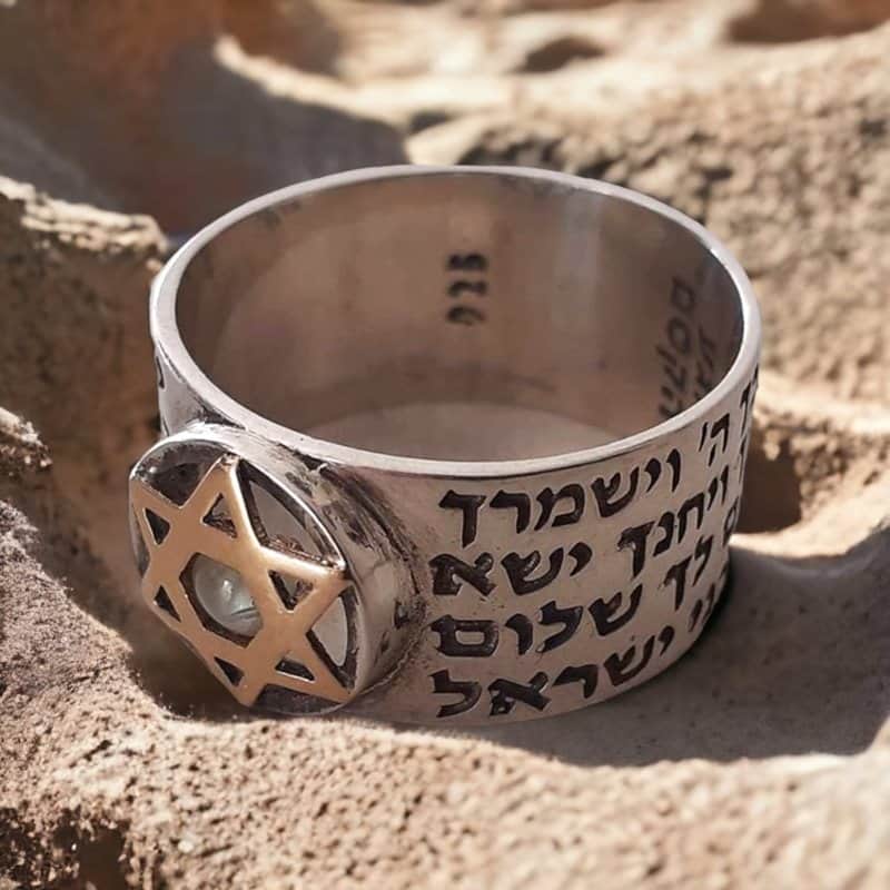 טבעת "מגן עמו"' , ברכת כהנים / תפילת מלאכים משובצת קריסובריל (לבחירה) , כסף וזהב