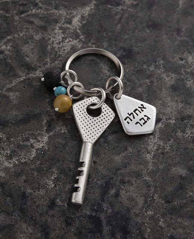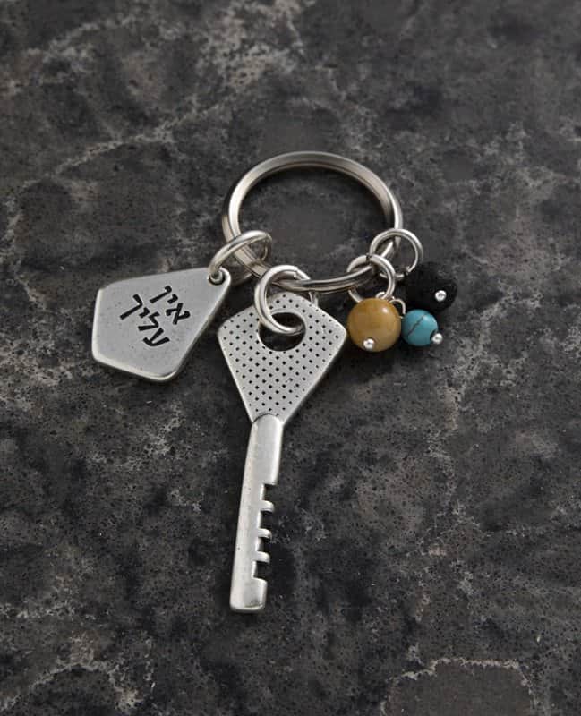 מחזיק מפתחות מצופה כסף טהור ומשולב באבני חן בגוונים שונים (טורקיז, לבה ומוקייט).