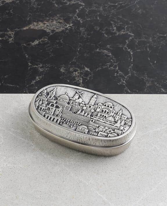 בחלקה העליון של הקופסא עיטור מרהיב של העיר ירושלים.