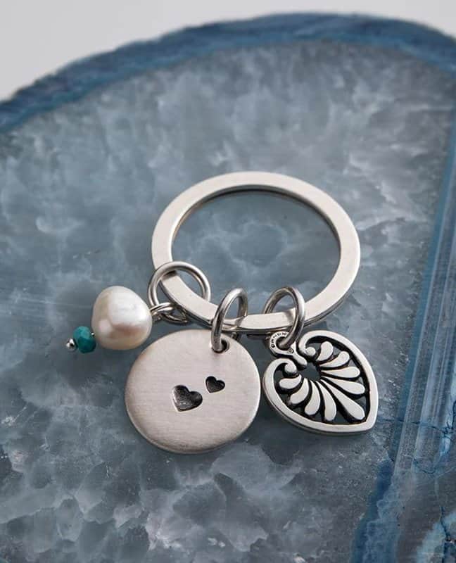 מחזיק מפתחות מהודר, מצופה כסף טהור ומעוטר בפנינה וטורקיז.