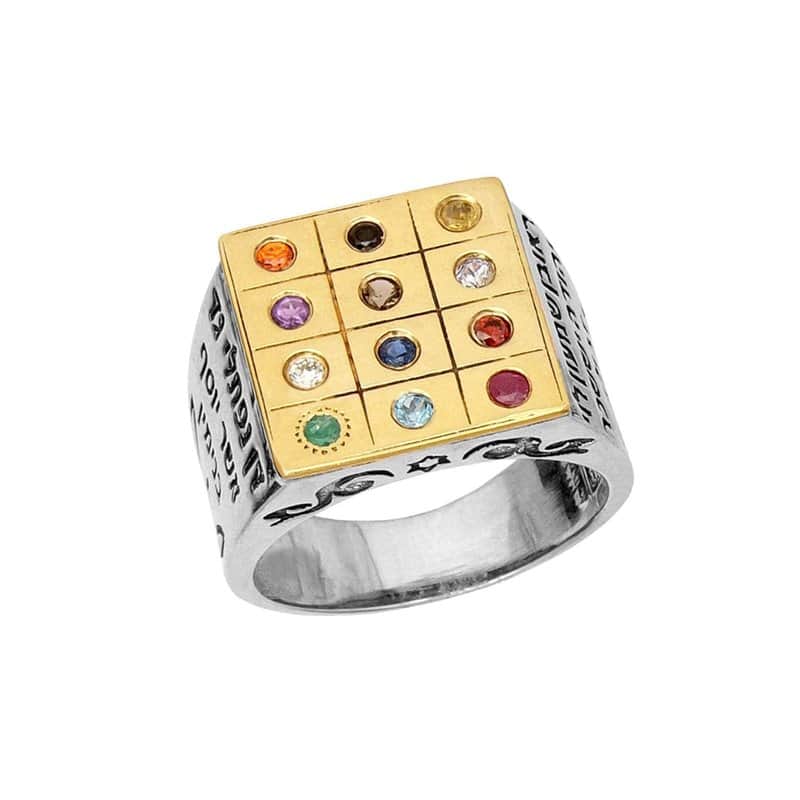 טבעת חותם לגבר משובצת אבני החושן , כסף וזהב