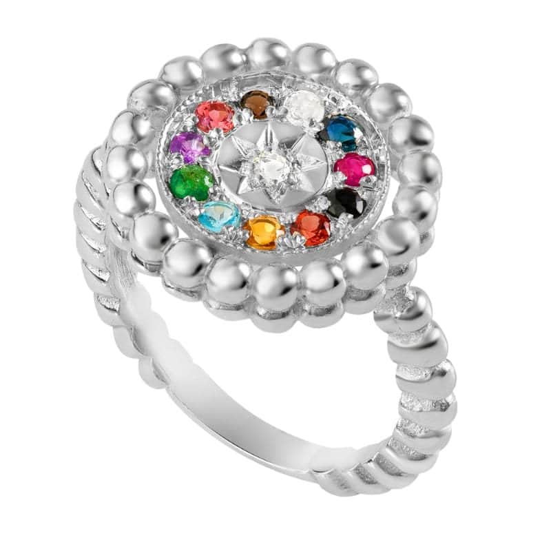 הטבעת כוללת 11 אבני חן טבעיות ובמקום יהלום שיבוץ זירקון לבן
