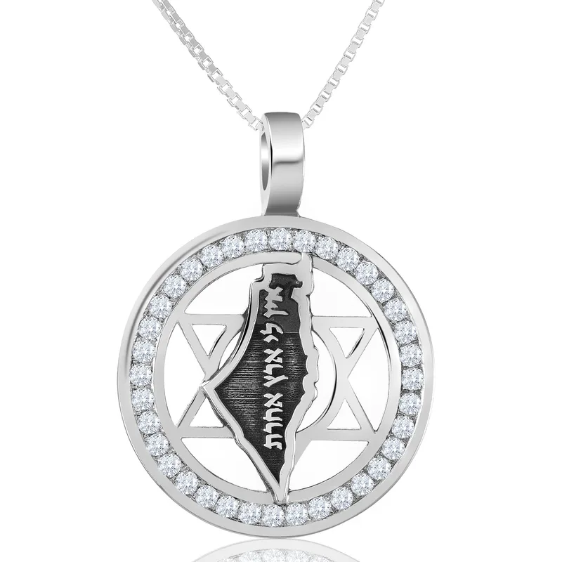 תליון ייחודי ומרשים, עשוי כסף סטרלינג 925, עם מגן דוד ומפת ארץ ישראל במרכז, משובץ אבני זירקון לבן מסביב, ובחריטה בולטת